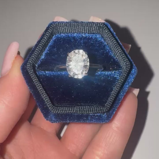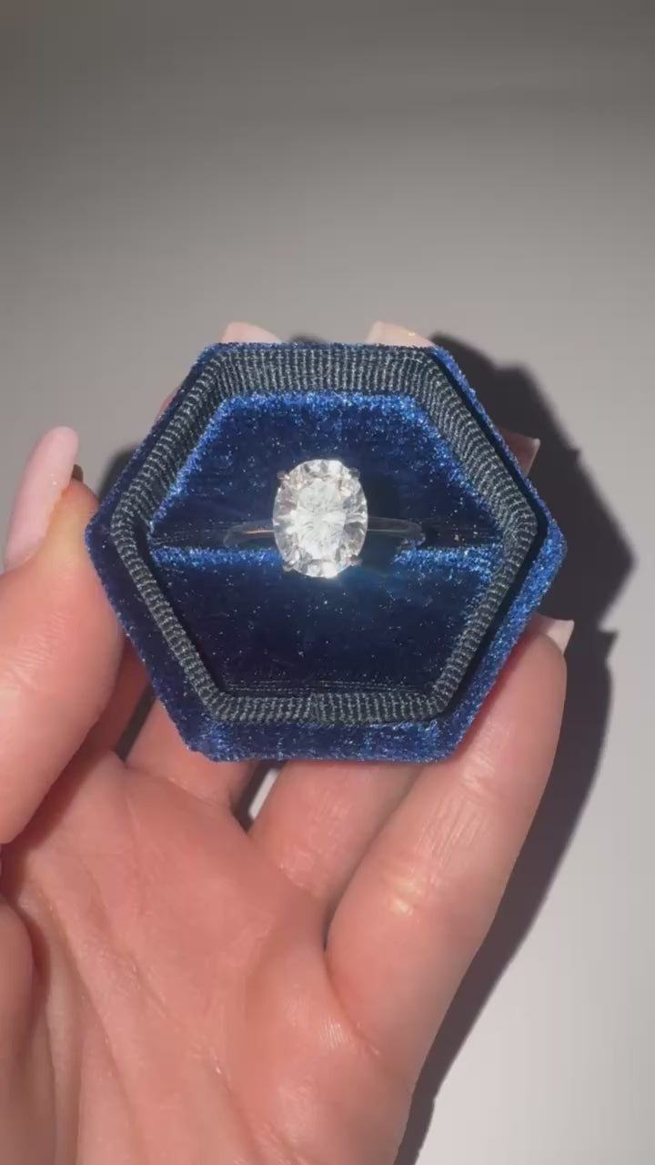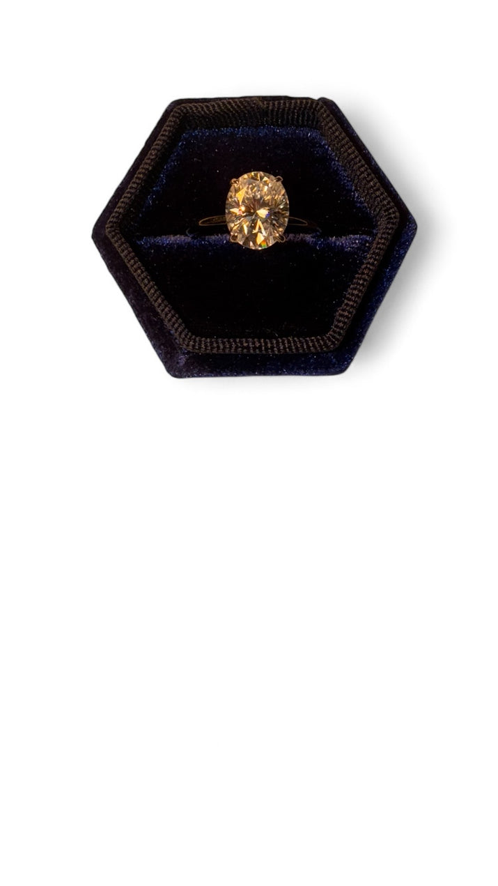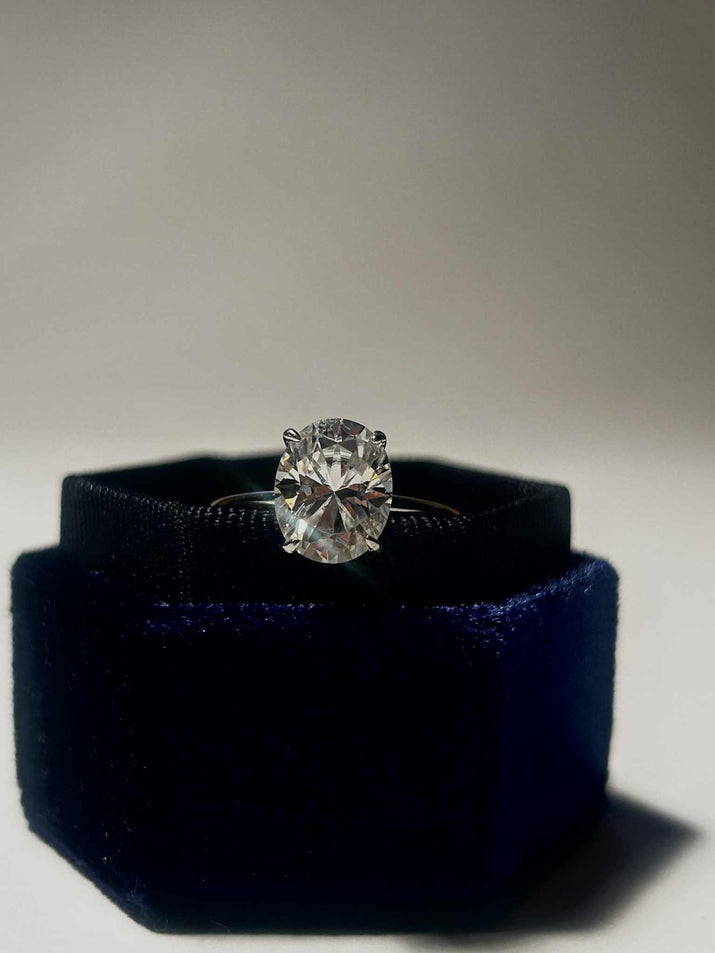 Centralny moissanit o masie 3 karaty w szlifie owalnym zachwyca doskonałą czystością i głębią blasku,