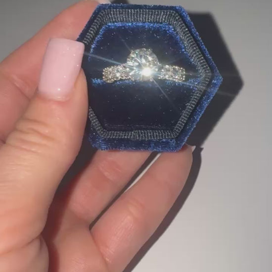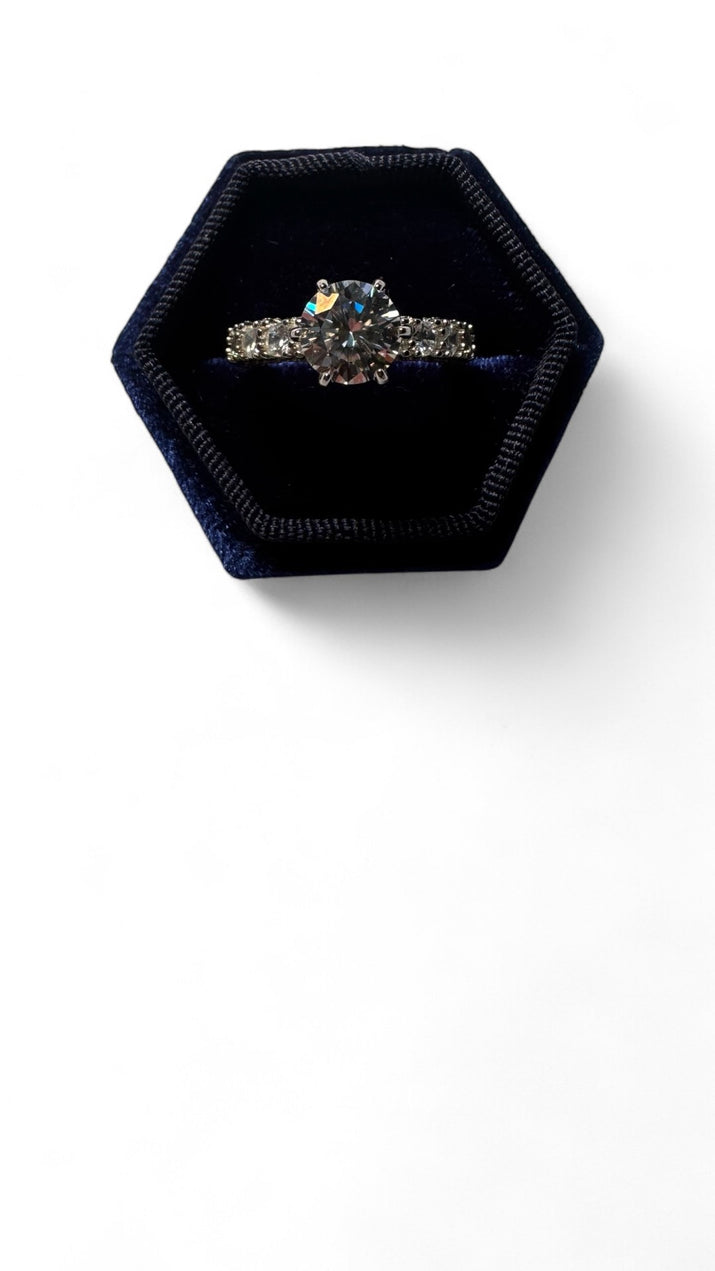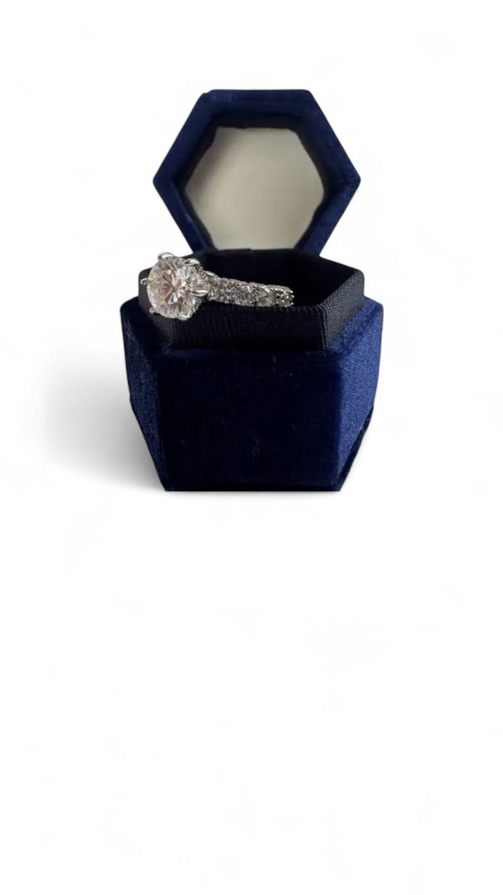 Ten zachwycający pierścionek zdobi imponujący moissanit o masie 3 karaty, osadzony w centralnej części kompozycji. Obrączka, bogato wysadzana drobnymi kamieniami, tworzy efekt niekończącego się blasku, który przyciąga spojrzenia z każdej strony.